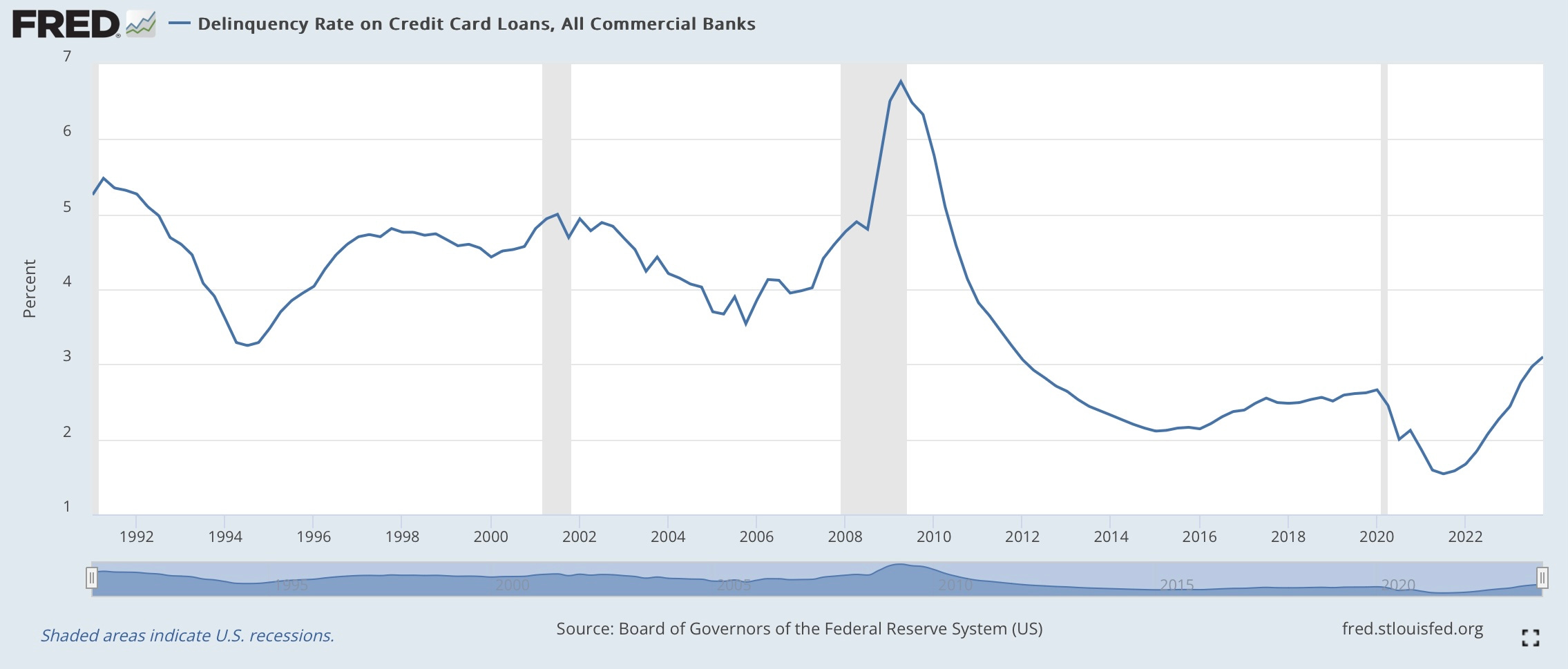 Another glimmer of hope came from the early-February release of the Fed’s quarterly Senior Loan Officer Survey which showed a significant tick down in the net percentage of banks tightening lending conditions. And to go along with that data, it appears as though the total growth in the nominal dollar volume of commercial and industrial loans outstanding has arrested its decline. That is not to say that the banking system is completely out of the woods yet, as commercial real estate may yet be a burden as we progress through the year, but the evidence from credit markets so far is that the rest of the real economy is holding up just fine. I will admit that I had my doubts 3-6 months ago based on the pace of rundown in “excess savings”, but despite an uptick in credit card deliquencies, households still seem like they are in decent shape relative to history. [see next exhibit]